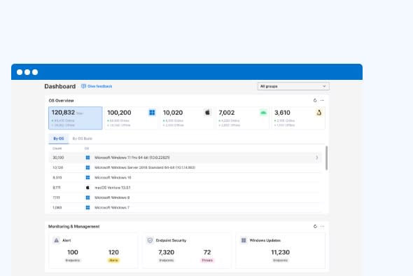 Gain oversight of all endpoints through a single-pane dashboard, allowing easy tracking of assets, monitoring security health, and maintaining compliance with SOC 2, ISO/IEC 27001, and other regulations.