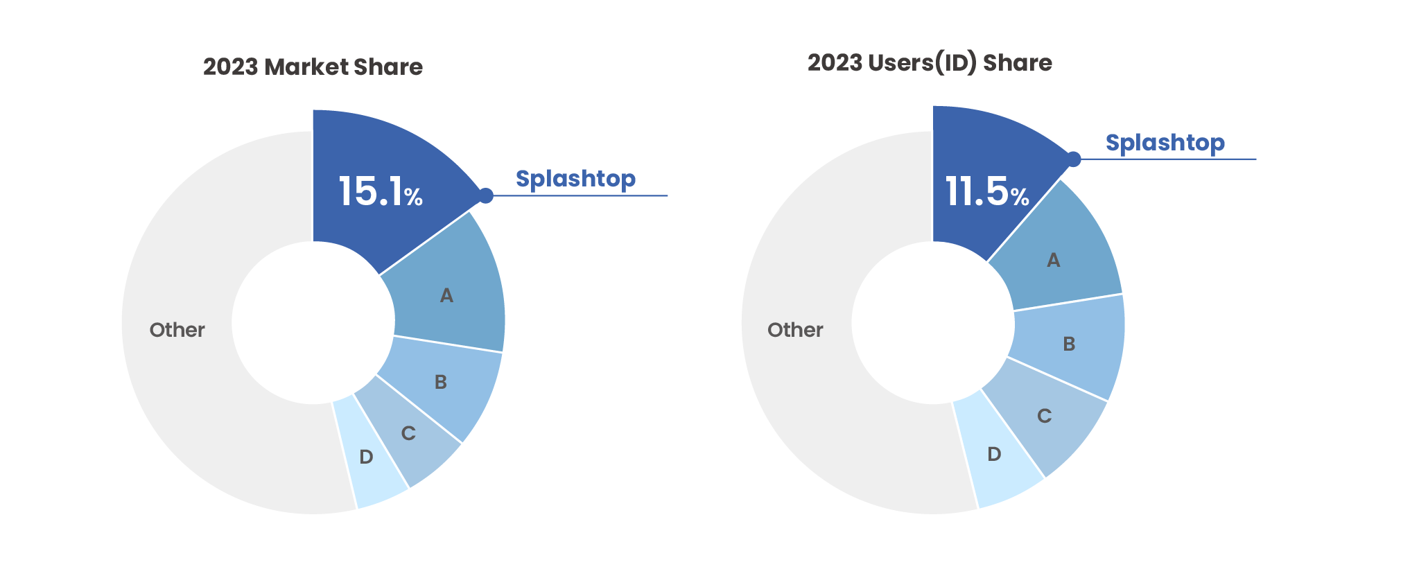 在本報告評估的遠端存取服務中,Splashtop 在 2023 財政年度的營收排名第一(預計在 2024 財政年度也是如此),市場佔有率為 15.1%。 該公司在用戶份額 (ID) 方面也排名第一,2023 財年為 11.5%。
